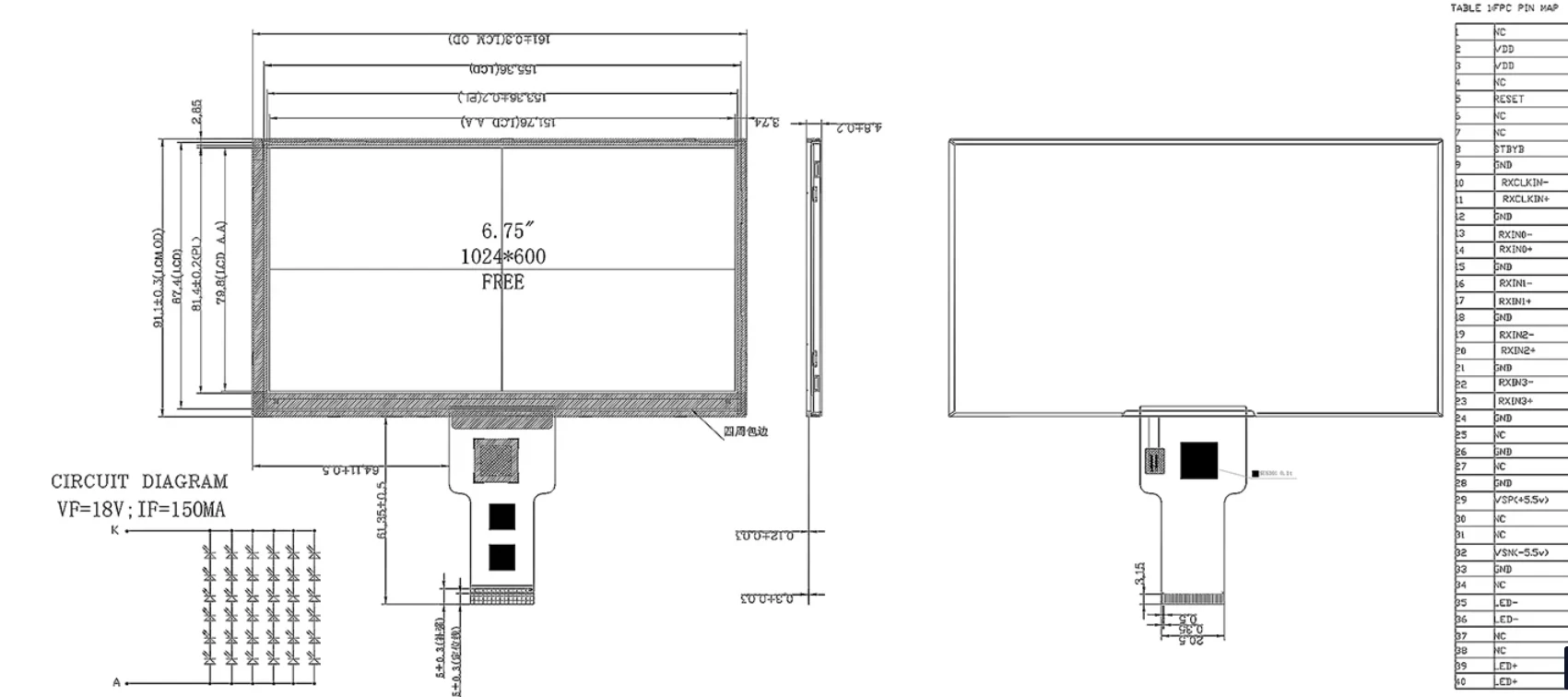 6.75 inci LED Backlight IPS TFT Small TFT Touch Screen Module menawarkan prestasi visual yang luar biasa. Dengan resolusi 1024 × RGB × 600, 16.7 juta warna, dan liputan warna NTSC 60%, ia memberikan warna yang kaya dan hidup. Nisbah kontras 1200: 1 (biasanya hitam) memastikan butiran tajam dan tajam.